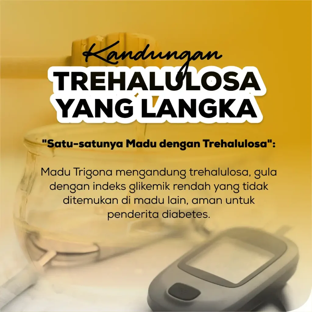 Madu Trigona mengandung Trehalulosa, disakarida unik dengan indeks glikemik rendah.